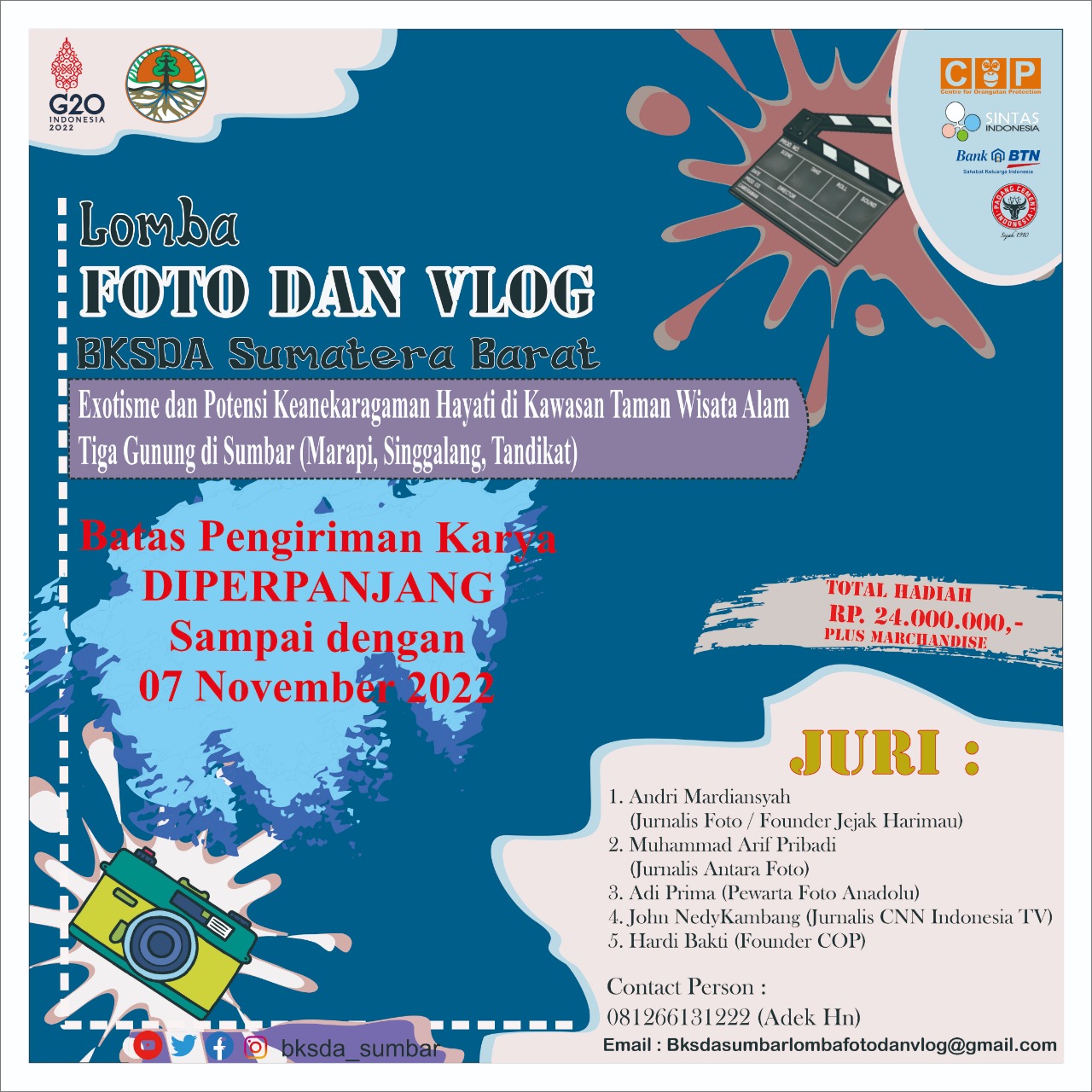 Mengingat ke 3 TWA masih di tutup, dan direncanakan untuk dilaunching pada tanggal 29 Oktober 2022 dan banyak nya permintaan dari penggiat fotografi Sumbar untuk memperpanjang pendaftaran dan pengiriman lomba foto dan vlog “Exotisme dan Potensi Keanekaragaman Hayati di Kawasan Taman Wisata Alam Tiga Gunung di Sumbar (Marapi, Singgalang, Tandikat)” , maka dengan ini panitia penyelenggara memutuskan MEMPERPANJANG pendaftaran dan pengiriman hingga tanggal 7 November 2022. Perpanjangan ini memberikan kesempatan peserta untuk dapat mendaki ke ketiga TWA tersebut, dan pengumuman pemenang akan disampaikan tanggal 10 November 2022.